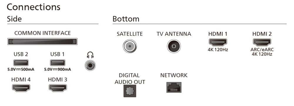 - HDMI 2.1: HDMI-1/-2 (volle Bandbreite 48 Gbit/s)