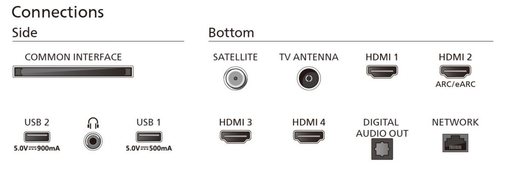 - 50/55/65 Zoll: 40 W (4x 10 W Full-Range-Lautsprecher)