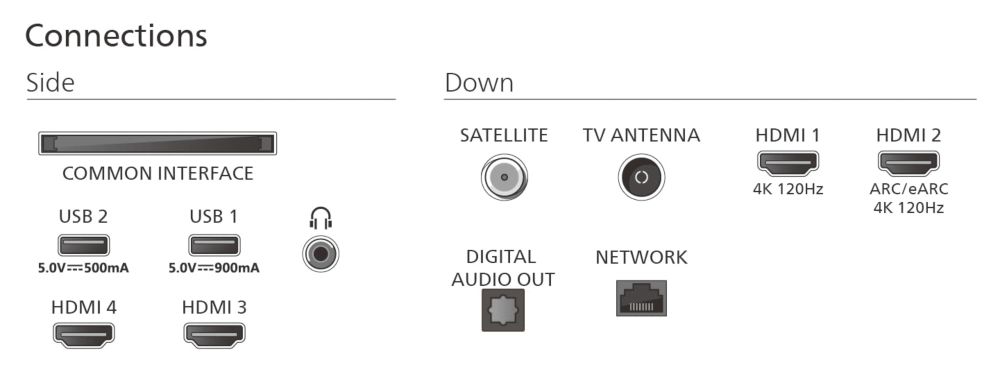 - HDMI 2.1: HDMI-1/-2 (volle Bandbreite 48 Gbit/s)